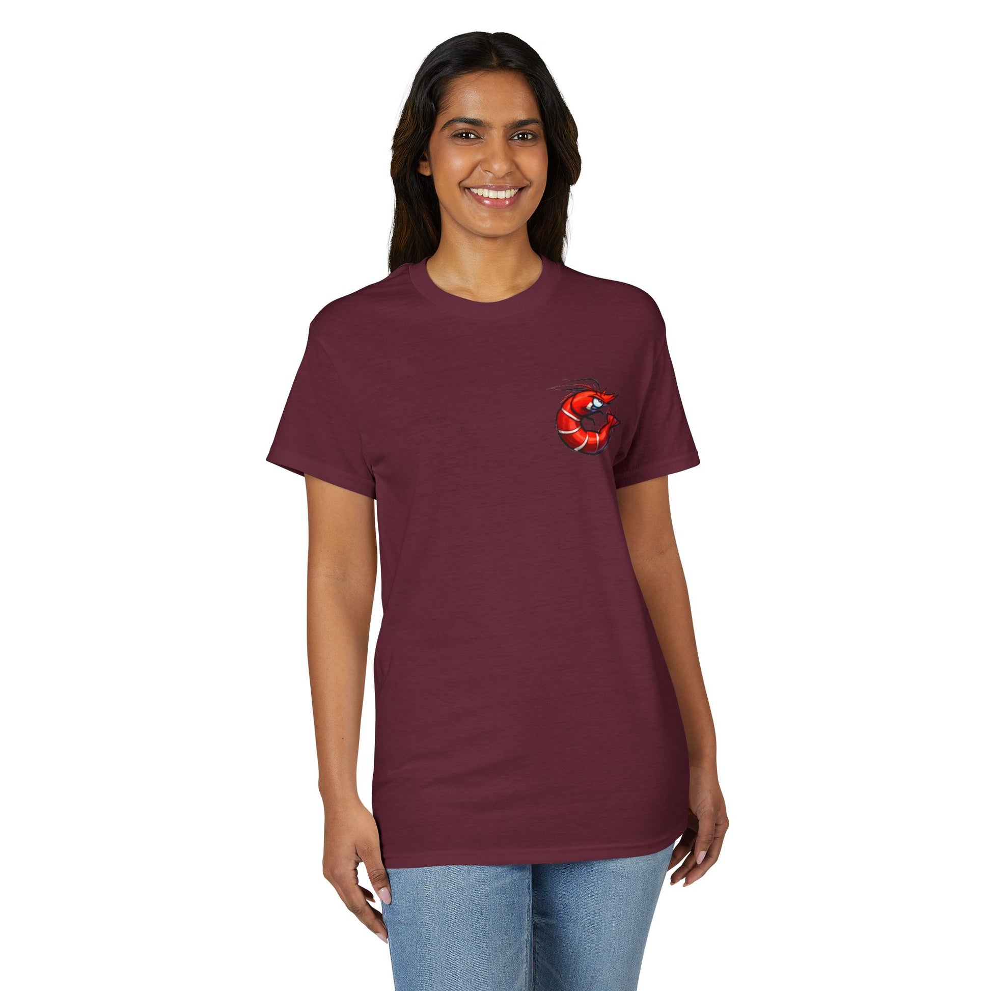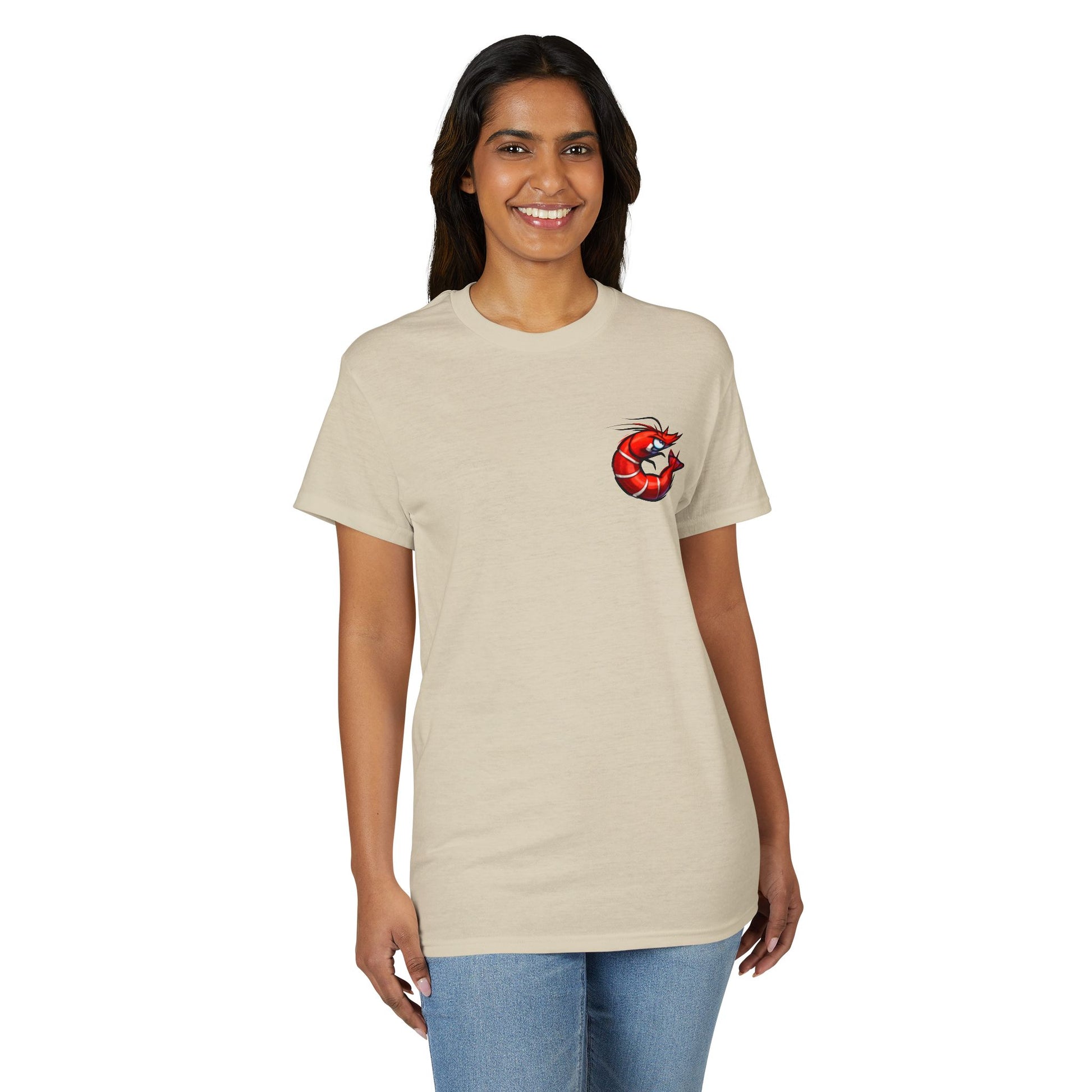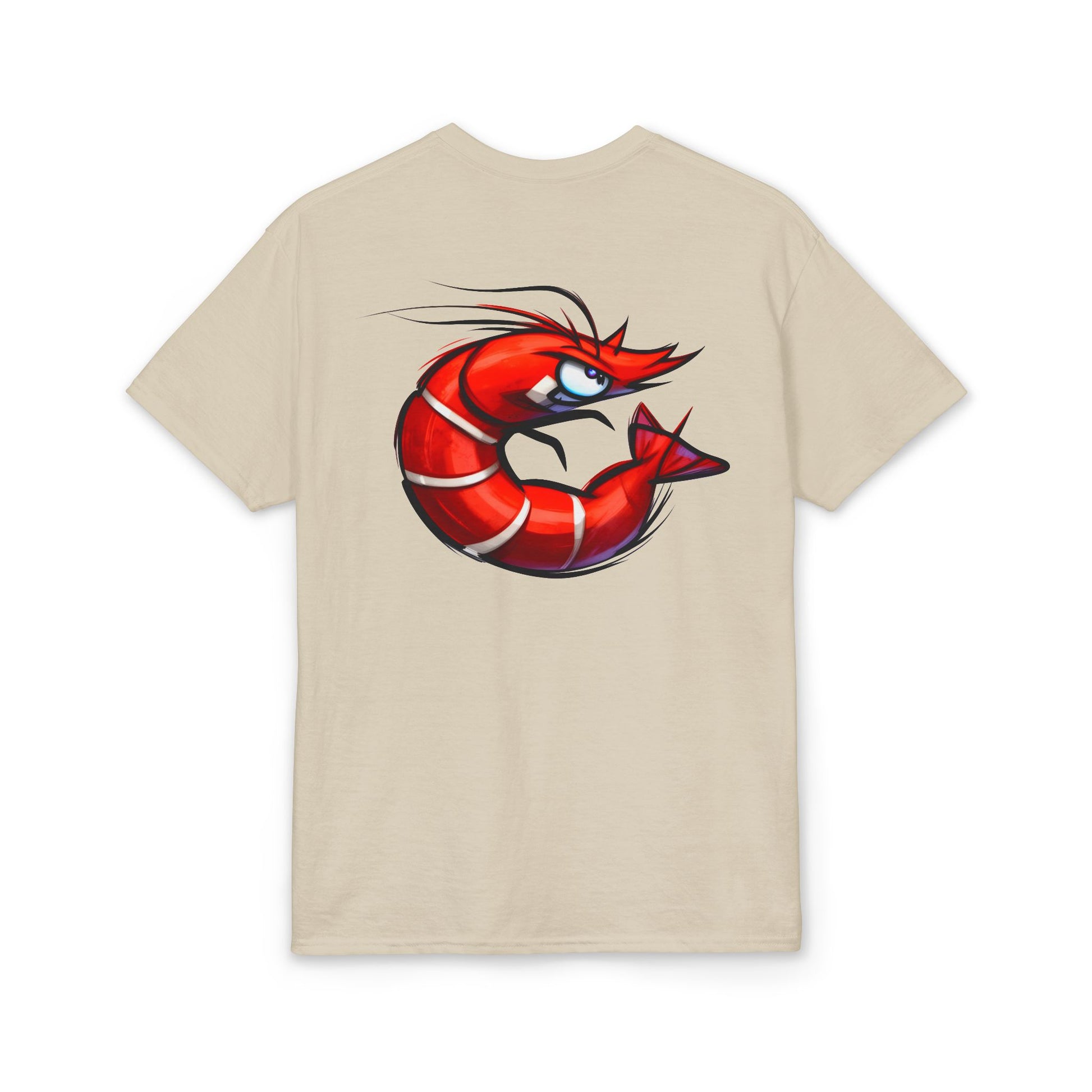 Spicy Shrimp Graphic T-Shirt — Retro Red Prawn Logo Tee
